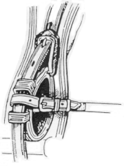 Alternativement, une bride, ou filet, peut être utilisé : une longe passée d’abord par l’anneau gauche du mors, puis sur la nuque, avant de l’attacher sur l’anneau droit.